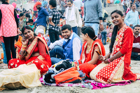 Varanasi India November 11, 2018 View of unknowns Indians people attenting and celebrating Dev Deepavali on the banks of the Ganges river in the afternoon
