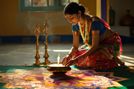 A young woman dressed in a bright saree delicately lights an oil lamp as part of an auspicious ritual. The colorful decor and soft light create a serene atmosphere. Nearby, ornate brass lamps add to the festive ambiance.