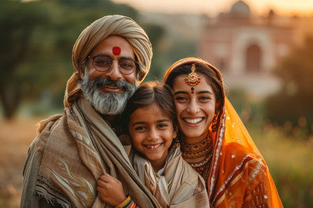 Happy Indian family in traditional clothing smiling at sunset with a historic monument in the background, representing cultural heritage and togetherness. Independence Day of India. With Generative AI technology.