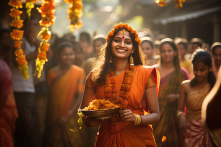 A young woman dressed in traditional attire holds a bowl with a warm smile. The vibrant setting highlights cultural beauty and the essence of celebrations.