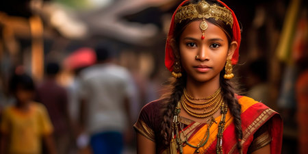 A young girl in India wears a colorful traditional headpiece adorned with flowers, while wearing a brightly colored traditional outfit. She gazes directly at the camera with a serious expression.