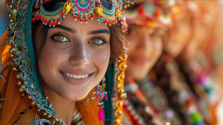 A group of young women dressed in colorful traditional attire participate in a cultural festival showcasing joy and elegance.