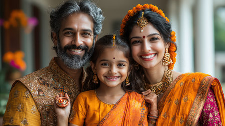 Indian family with traditional clothing celebrating diwali or hindu festival