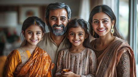 Portrait of a cheerful Indian family smiling together, wearing traditional clothing, capturing a moment of love and togetherness