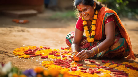 Beautiful Indian woman traditionally dressed making rangoli from flowers near the house in India