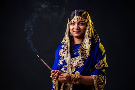 beautiful indian woman aromatic stick diwali holiday on black background studio