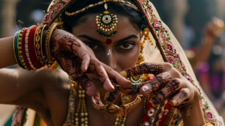 A close-up shot of a traditional dancer's hands gracefully manipulating intricate props during a performance at the Diwali festival in India.