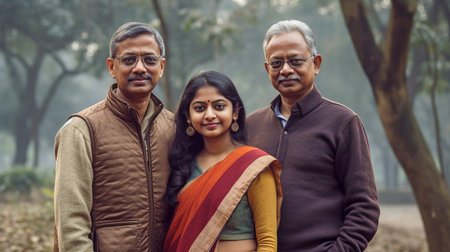 A young Indian woman and her parents are depicted in a Generative AI family photo in a park in Delhi.