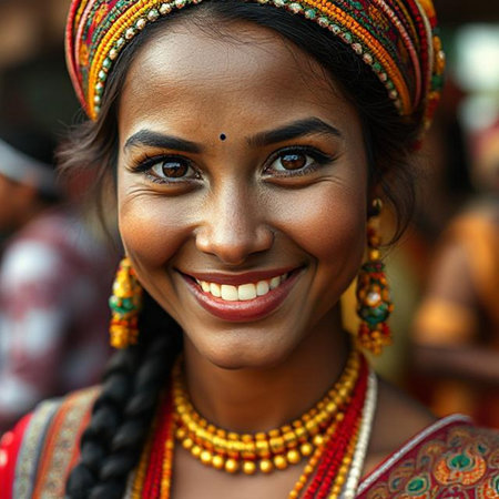 A joyful young woman smiles brightly with vibrant face paint in celebration of Indian culture, capturing the essence of tradition and festive spirit.