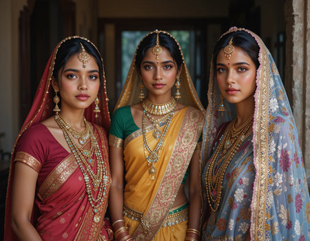 Three beautiful Indian women in saree posing in the room.