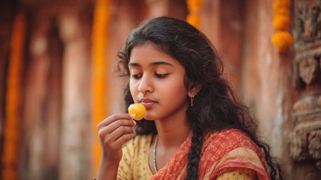 Beautiful indian woman eating mango in front of a temple.