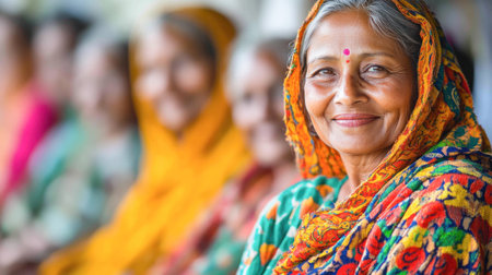 Indian woman wearing a colorful sari is smiling in the foreground with other people out of focus behind her