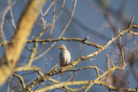 A song thrush sits in the branches of a tree.