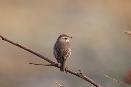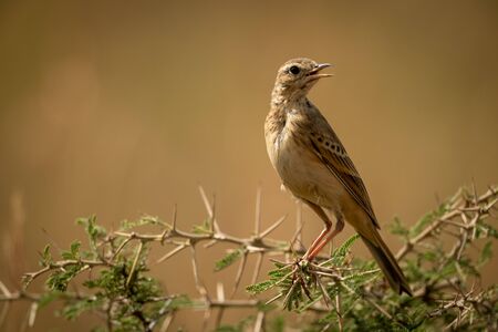 Grassland pipit on thorny branch turns head