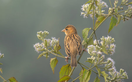 a small bird perches on a branch in a small grassy area, surrounded by light green and brown tones. captured with a nikon af600, the photo showcases photorealistic detailing. the composition is majestic, earning it the title of contest winner. this stunning image follows the larme kei style and can be found on flickr. ai generated