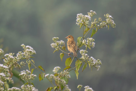 Reed bunting (Emberiza schoeniclus) perched on a pink flower