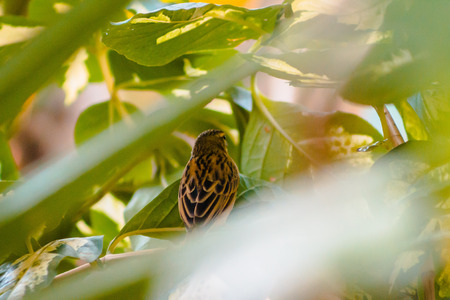 Close up bird hiding in grass concept photo. Dried plants. Summertime