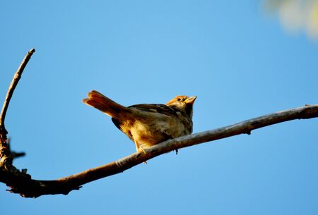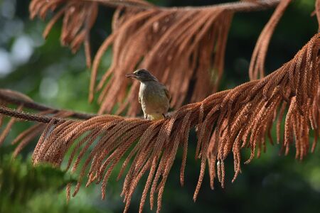 Sparrow sitting on a branch of a coniferous tree