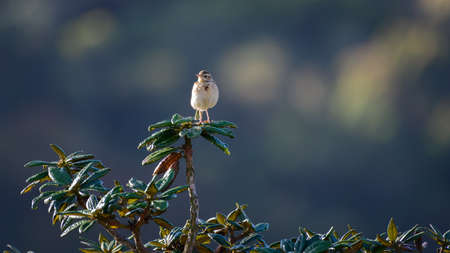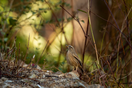 Upland pipit or Anthus sylvanus bird perched on rock in natural green background at foothills of himalaya uttarakhand india asia