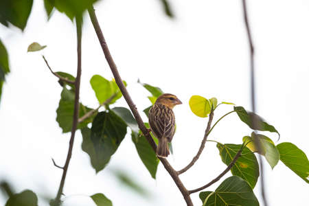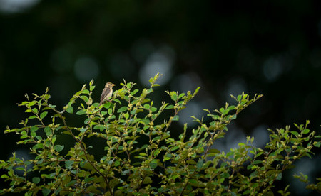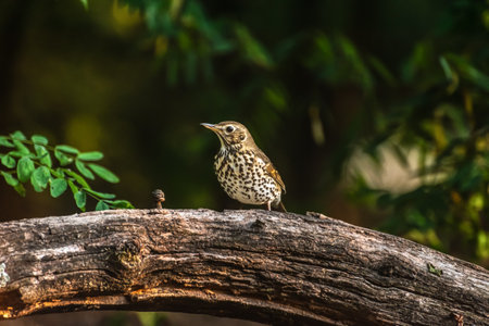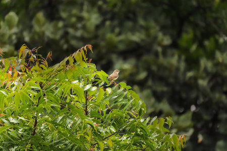 Small bird with brown and beige feathers perched on the branch of a tree with vibrant green leaves, enjoying the serene atmosphere of nature during autumn