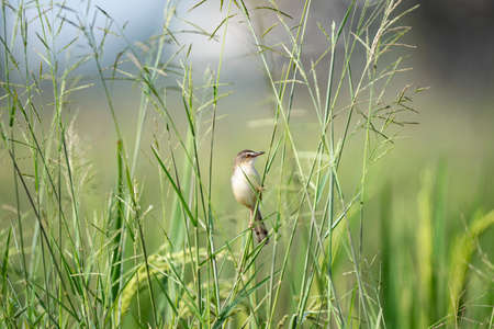 Small warbler bird Zitting cisticola or Cisticola juncidis perched on a branch