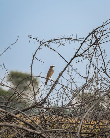 wild long billed pipit or brown rock pipit or Anthus similis bird perched on dry branch in winter season safari at forest national park of india