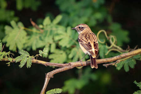 Closeup of a Whinchat bird, Saxicola rubetra, foraging in vegetation