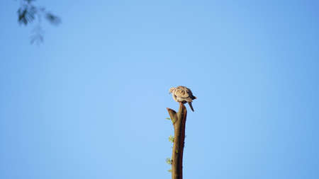 A plain prinia is perching on a dry wood branch bathin sunlight in the morning.
