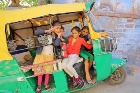 JODHPUR, RAJASTHAN, INDIA - DECEMBER 17, 2017: Portrait of children smiling and posing inside a Tuk Tuk
