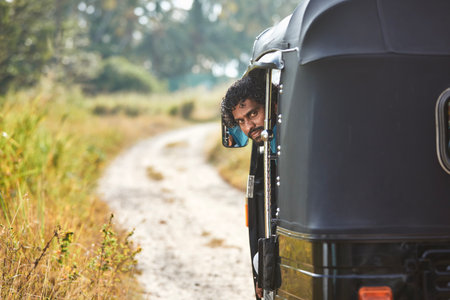 Portrait of tuk tuk driver on rural road. Popular three wheeled motorcycle in Sri Lanka.
