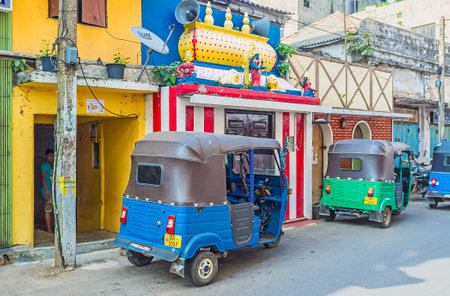 COLOMBO, SRI LANKA - DECEMBER 7, 2016: The tuk tuks, parked next to the Hindu Shrine in Sea street, Pettah district, on December 7 in Colombo, Sri Lanka.