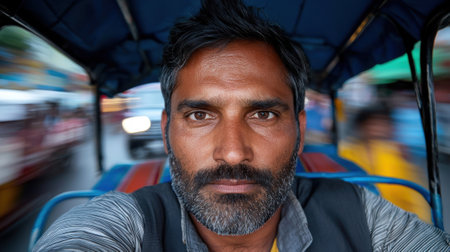 Close-up portrait of a young Indian male taxi driver with a friendly expression, sitting in the driver's seat of a taxi.