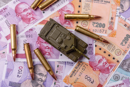 Money and flag of India with ammunition and tank as a concept of weapons and preparation for war. India and weapons, defense of the country from attack