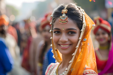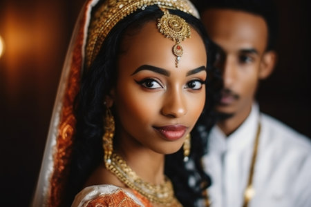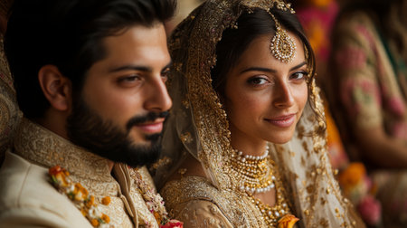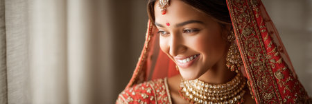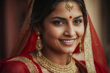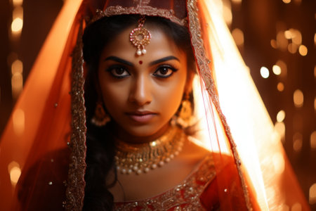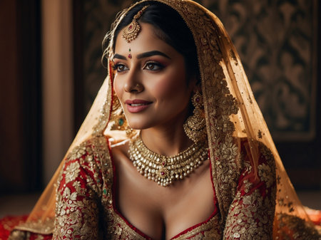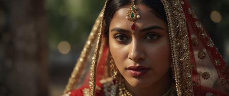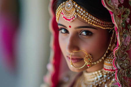 Close-up of an indian bride adorned in exquisite jewelry and makeup, showcasing cultural beauty