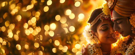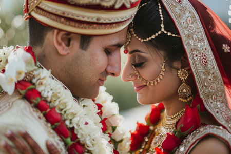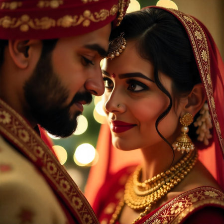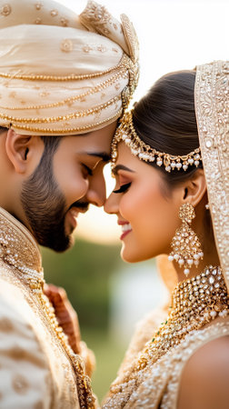 Couple enjoying intimate moment, gently touching foreheads while dressed in elegant traditional wedding attire. Outdoor setting with soft golden light creates romantic atmosphere.
