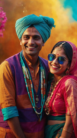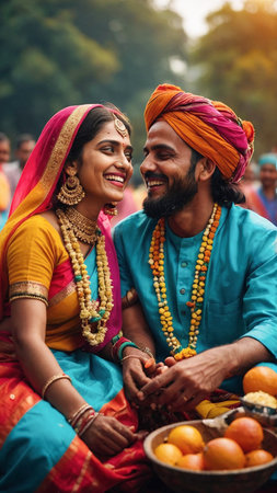 Teej festival - Colorful Couple in Traditional Clothing Celebrating, Space for Text