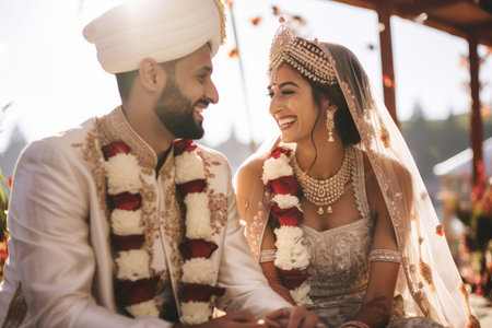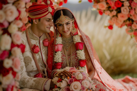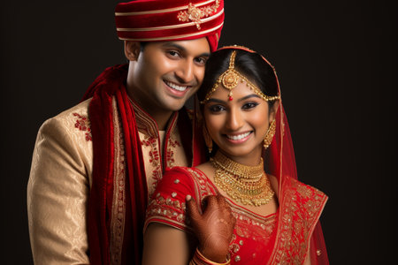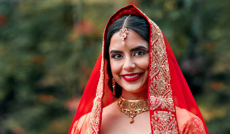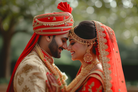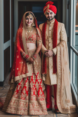 Beautiful Indian bride and groom in traditional wedding dress posing outdoor