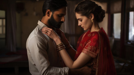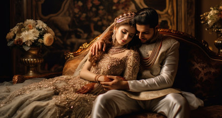 A close-up of an Indian bride and groom, from an Indian wedding, a romantic shot, hugging each other