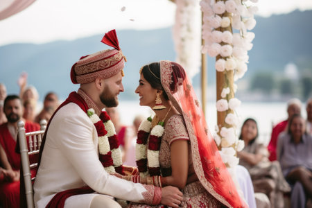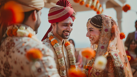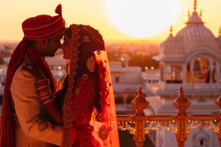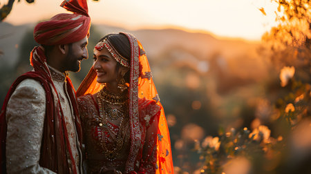 Couple captured in celebration of wedding, adorned in traditional attire. Warm sunset creates romantic ambiance, highlighting cultural richness and joyful union.