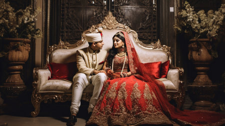 Couple Dressed in Traditional Attire During a Wedding Ceremony in an Ornate Venue Filled With Decorations and Guests Generative AI