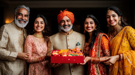 Group of indian friends in traditional Indian attire, holding and smiling at open red gift box filled with sweets