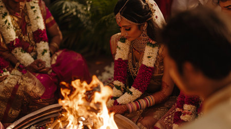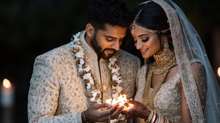 Bride and Groom Around Sacred Fire During Traditional Ceremony at Evening Festivities