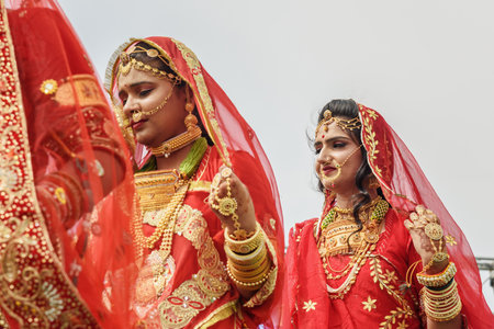 Jaisalmer, India - February 17, 2019: Indian girls dressed in red sari and adorned with traditional Indian jewellery in Desert Festival in Jaisalmer. Rajasthan