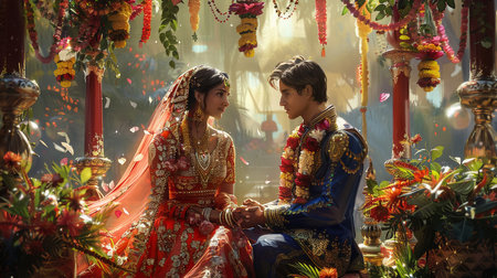 Traditional indian wedding ceremony, bride and groom holding hands with flowers