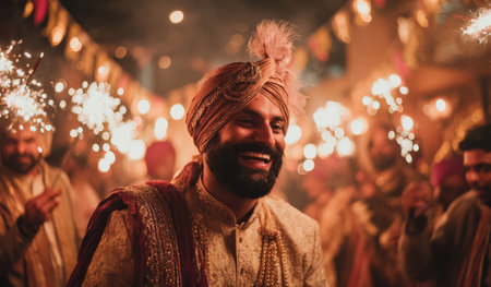 A cheerful man dressed in traditional attire enjoys a vibrant celebration at night. Bright sparklers light up a lively street filled with joyous people and festive decorations.
