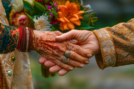 Close Up of Diverse Senior Couple Holding Hands with Traditional Indian Henna Tattoo and Floral Bouquet AI Generative