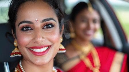 Two joyful Indian women dressed in traditional attire sit together in a car, showcasing their vibrant smiles and beautiful jewelry, embodying warmth and friendship.