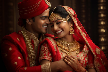 a happy indian bride and groom wearing traditional red attire bokeh style background