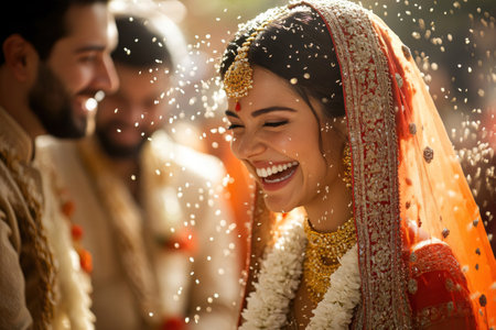 Indian bride laughing during traditional wedding ceremony with rice showering down