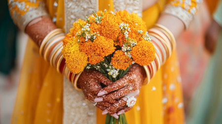 Elegant close-up of indian bride holding marigold bouquet with henna-decorated hands. concept of cultural celebration, wedding traditions, bridal elegance.